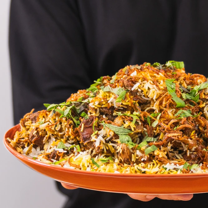 Slow-cooked tender Zabiha Halal goat meat layered with fragrant basmati rice, aromatic spices, and caramelized onions for a royal feast.